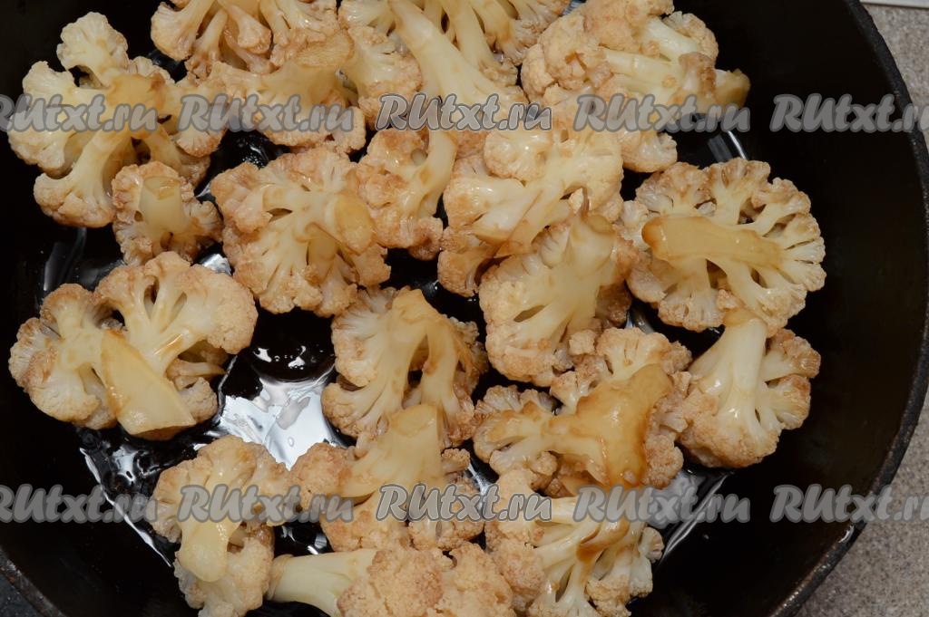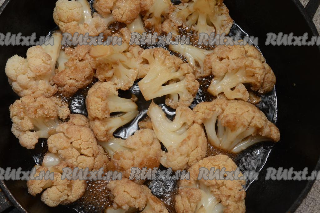 Большую сковороду (у меня сковорода диаметром 28 сантиметров) хорошо разогреть с добавлением растительного масла. Выложить соцветия цветной капусты на сковороду в один слой, влить 2-3 столовых ложки соевого соуса из миски, в которой мариновалась капуста.