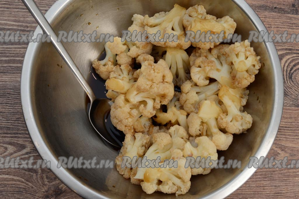 Поместить отваренные соцветия в глубокую миску, влить соевый соус, перемешать, покрывая цветную капусту соусом со всех сторон. Оставить цветную капусту промариноваться в соевом соусе не менее, чем на 10 минут. За это время 3-4 раза нужно брать со дна миски столовой ложкой соевый соус и поливать цветную капусту сверху.