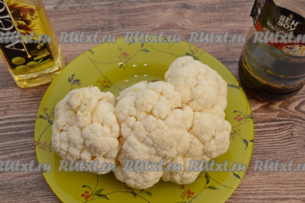 С соевым соусом чаще всего готовят мясные и рыбные блюда. А я предлагаю приготовить отличный овощной гарнир - цветную капусту, жаренную с соевым соусом на сковороде. Блюдо готовится без соли, так как солёности соевого соуса итак достаточно. Цветная капуста получается очень мягкой, нежной, соевый соус добавляет пикантности и гармонично сочетается со вкусом капусты.
