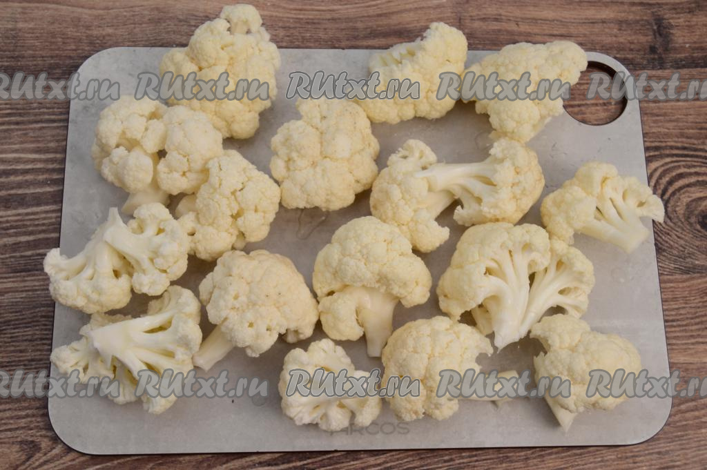 Цветную капусту промыть, срезать тёмные места, если они есть. Нарезать капусту на средние по размеру соцветия.