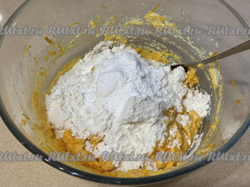 Всыпать весь разрыхлитель и 50 грамм муки, перемешать.