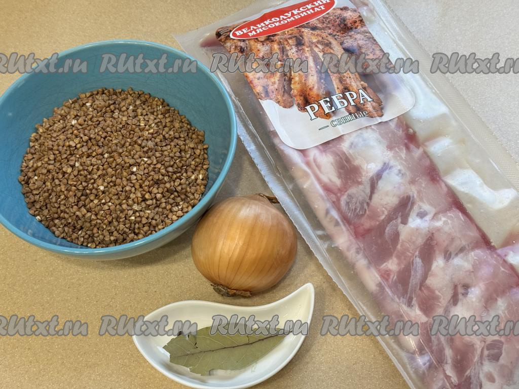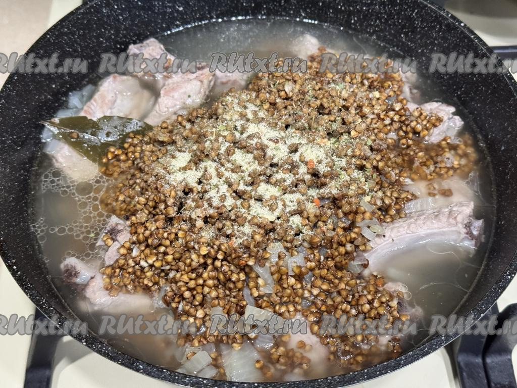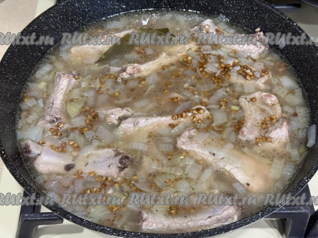 Перемешать гречку с рёбрами, довести бульон до кипения, уменьшить огонь до минимума. Закрыть сковороду крышкой, готовить минут 20-25 (до полного впитывания воды).