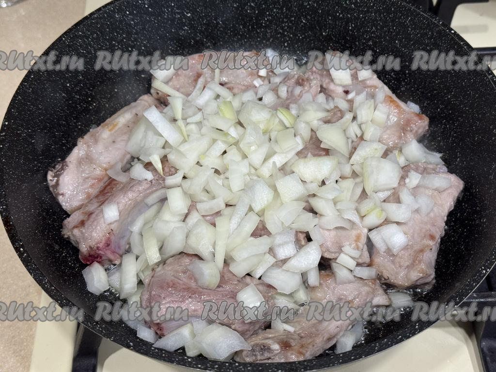Обжарить рёбра с луком в течение 5 минут (до прозрачности лука), иногда перемешивая, на среднем огне.