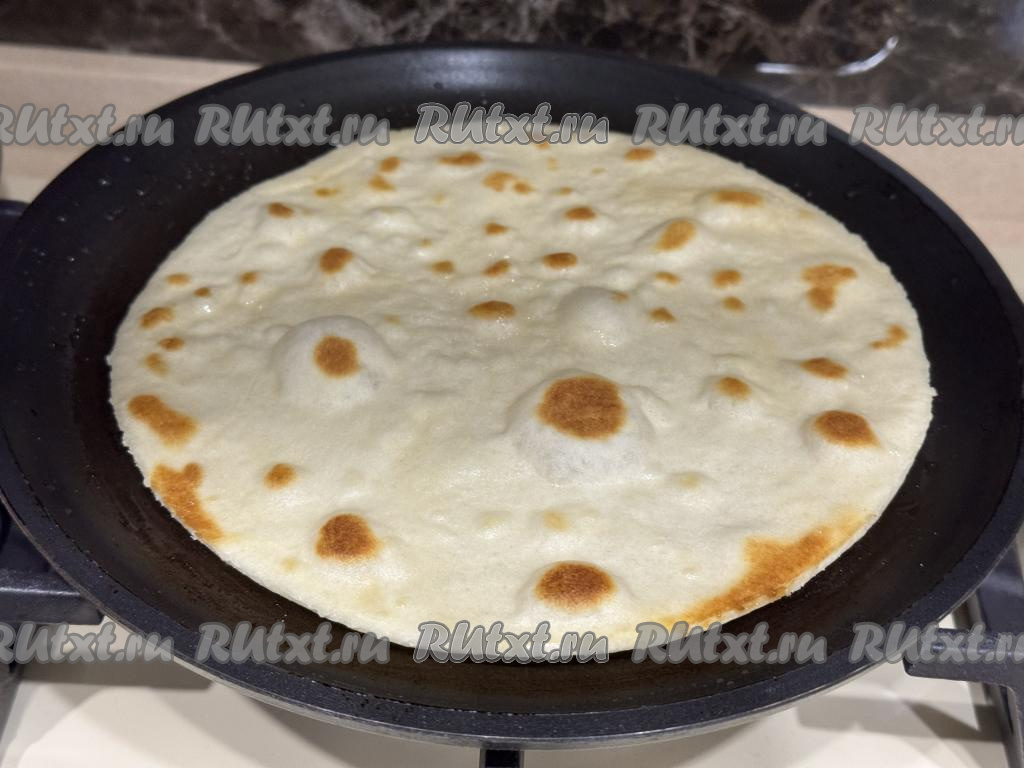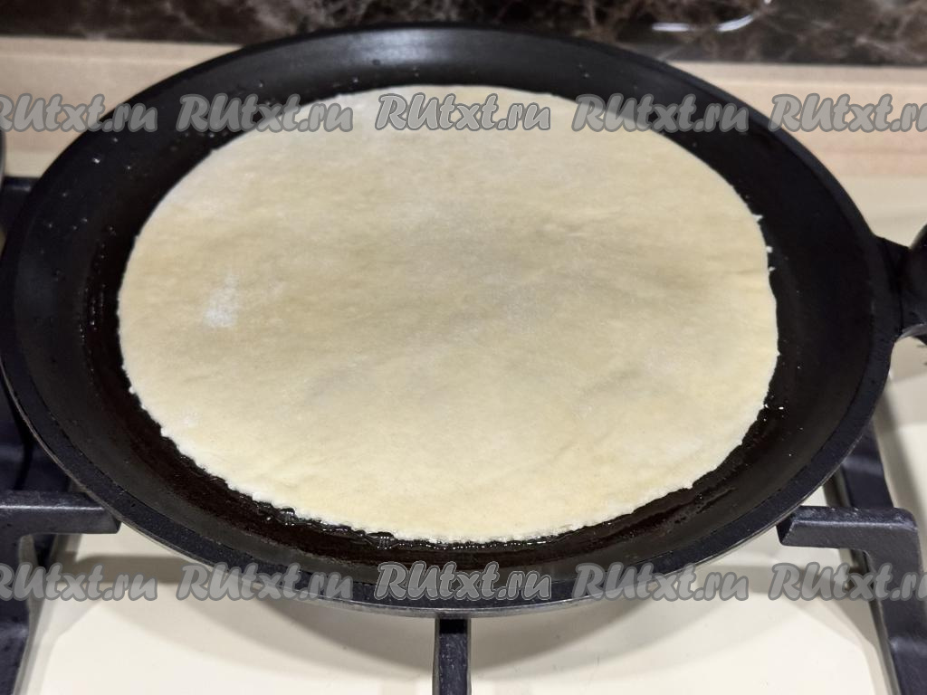 Хорошо разогреть сухую сковороду, уменьшить огонь до среднего. Выложить одну лепёшку на сковороду.