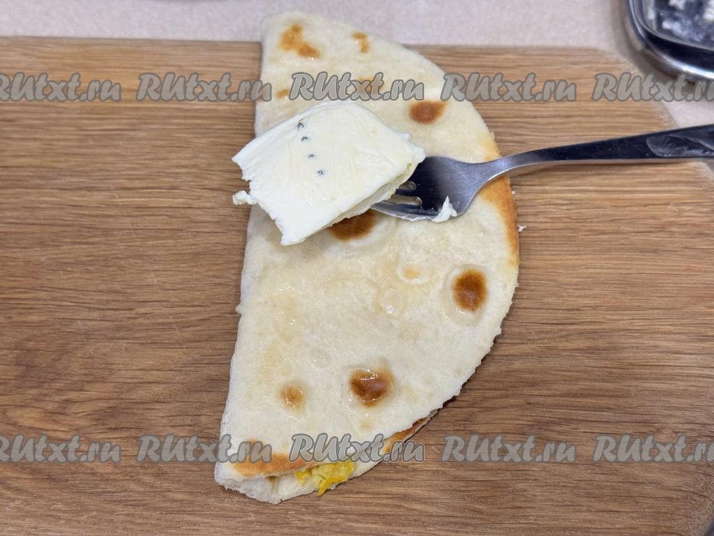 Накрыть сторону с начинкой чистой стороной лепёшки. Сразу обильно смазать горячий кыстыбый с двух сторон сливочным маслом. Выложить на тарелку. Благодаря маслу лепёшка станет более нежной и мягкой.