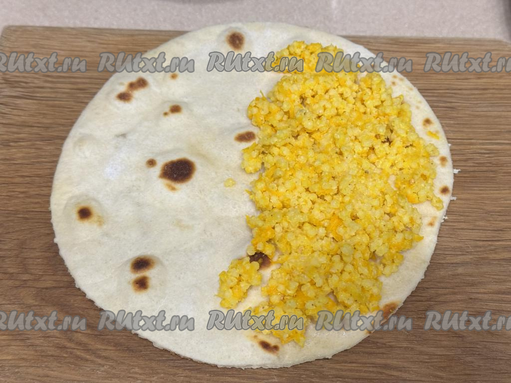Горячую лепёшку переложить со сковороды на доску. Отступив от краёв одной половины лепёшки по 1-1,5 сантиметра, равномерно выложить 2 столовых ложки каши.