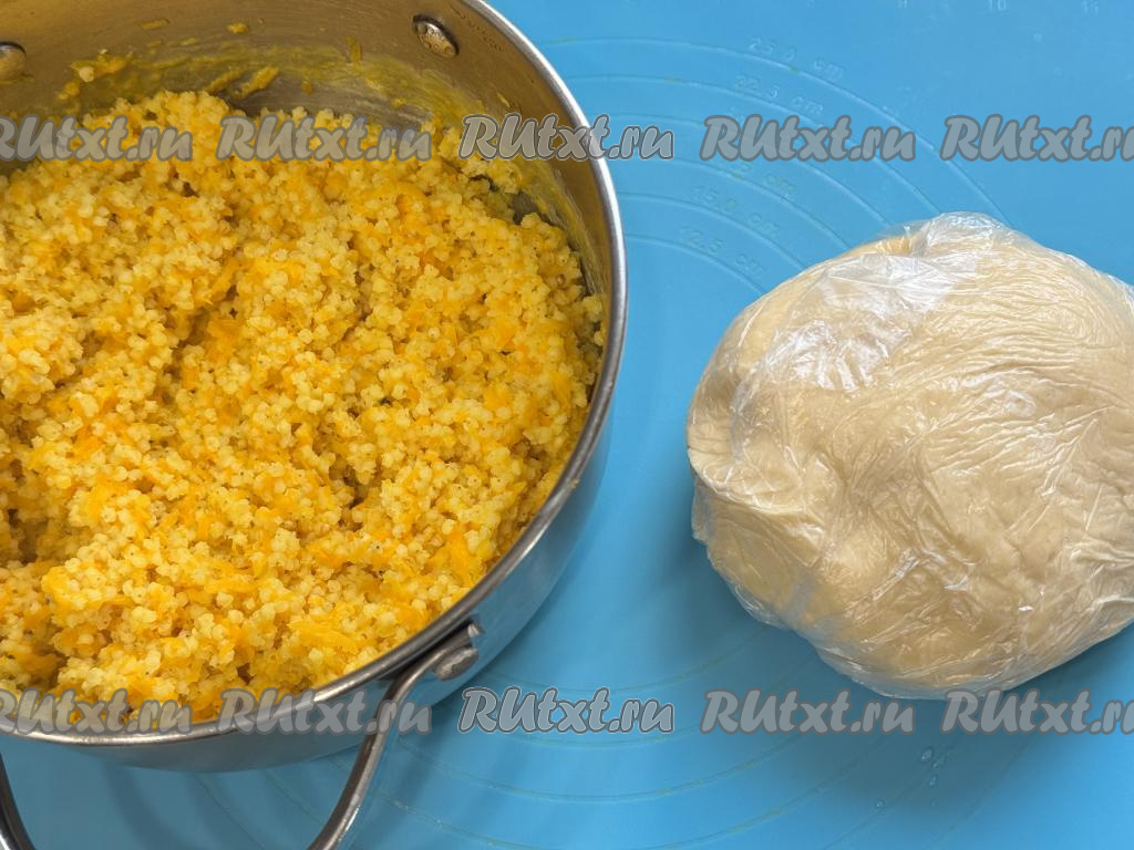 Добавляя частями муку и каждый раз полностью вмешивая её, учитывайте, что тесто должно получиться мягким, нежным, не липнущим к рукам. Завернуть тесто в пищевую плёнку, чтобы оно не заветривалось, и оставить на время, пока доваривается, а затем слегка остывает каша.