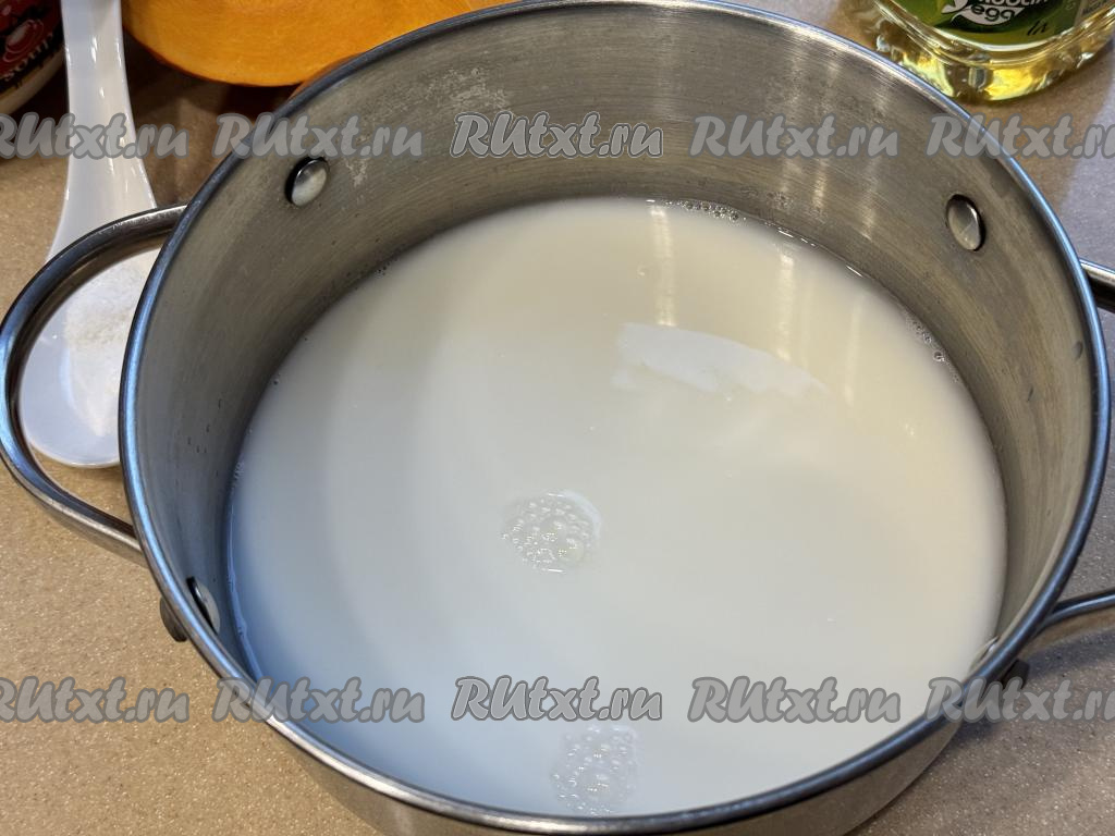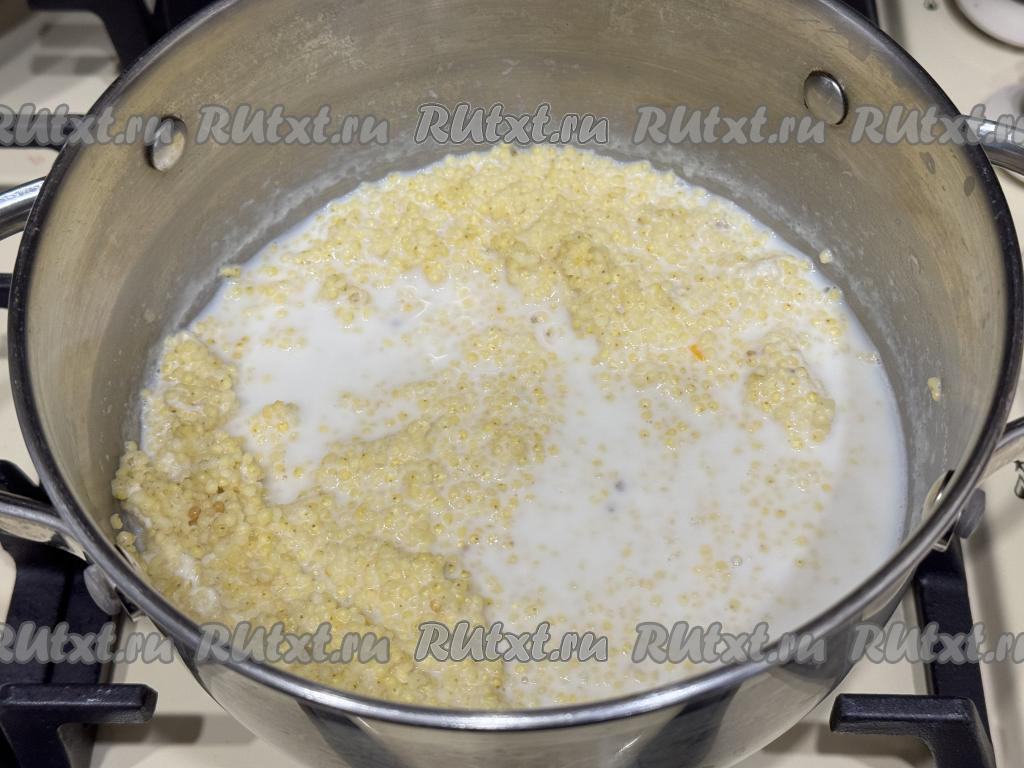 Залить пшено молоком и водой, поставить кастрюлю на огонь, перемешать.