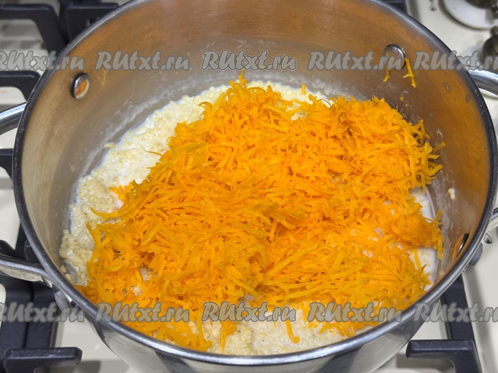 Пока варится пшено, нужно 100 грамм тыквы, очищенной от кожуры, волокон и семечек, натереть на мелкой тёрке. После того как пшено с момента закипания молока и воды проварится 15 минут, в кастрюлю добавить натёртую тыкву, перемешать получившуюся тыквенно-пшённую кашу. Варить на небольшом огне 15 минут, иногда перемешивая.