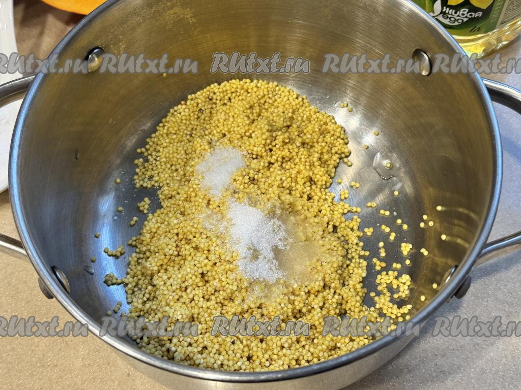 Прежде всего займёмся начинкой из пшена и тыквы для кыстыбыя. Пшено нужно всыпать в сито, хорошо промыть проточной водой. Затем можно обдать промытую крупу кипятком, чтобы пшено не горчило. Лишней воде дать стечь. Подготовленное пшено выложить в кастрюлю, добавить соль и сахар.