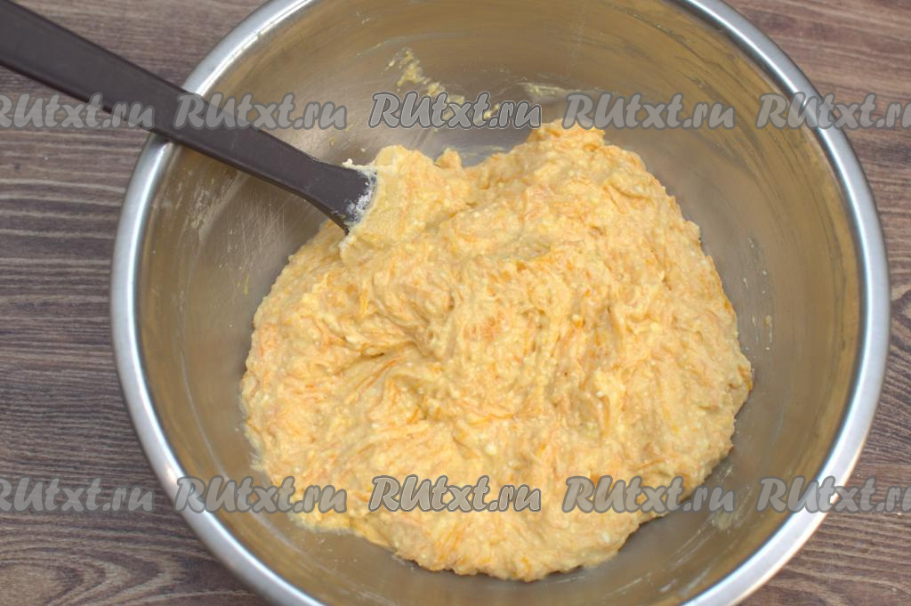 Пока натирали тыкву, творожная масса вступила в реакцию с содой, стала более воздушной и немного увеличилась в объёме.