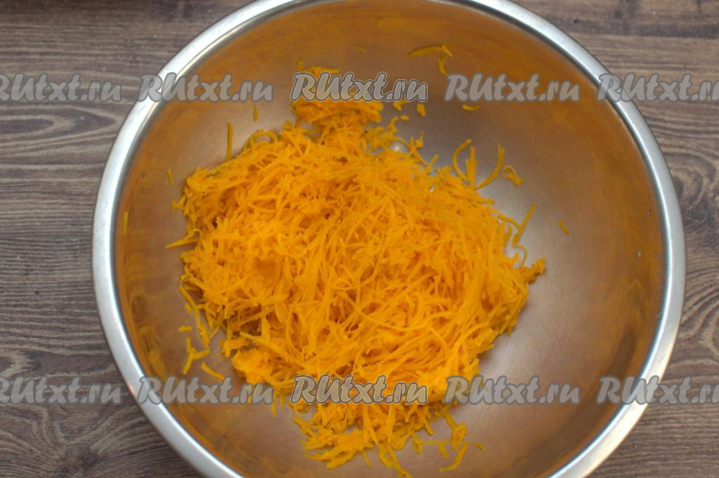 Натереть очищенную тыкву на мелкой тёрке.