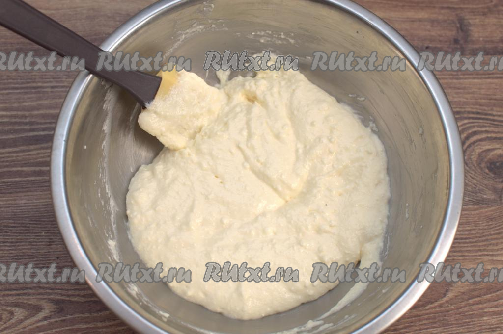 Размять творог с яйцами и сахаром до однородности лопаткой (или столовой ложкой). Если творог у вас крупиньчатый, тогда можно пробить творог с яйцами и сахаром погружным блендером, чтобы масса стала однородной.