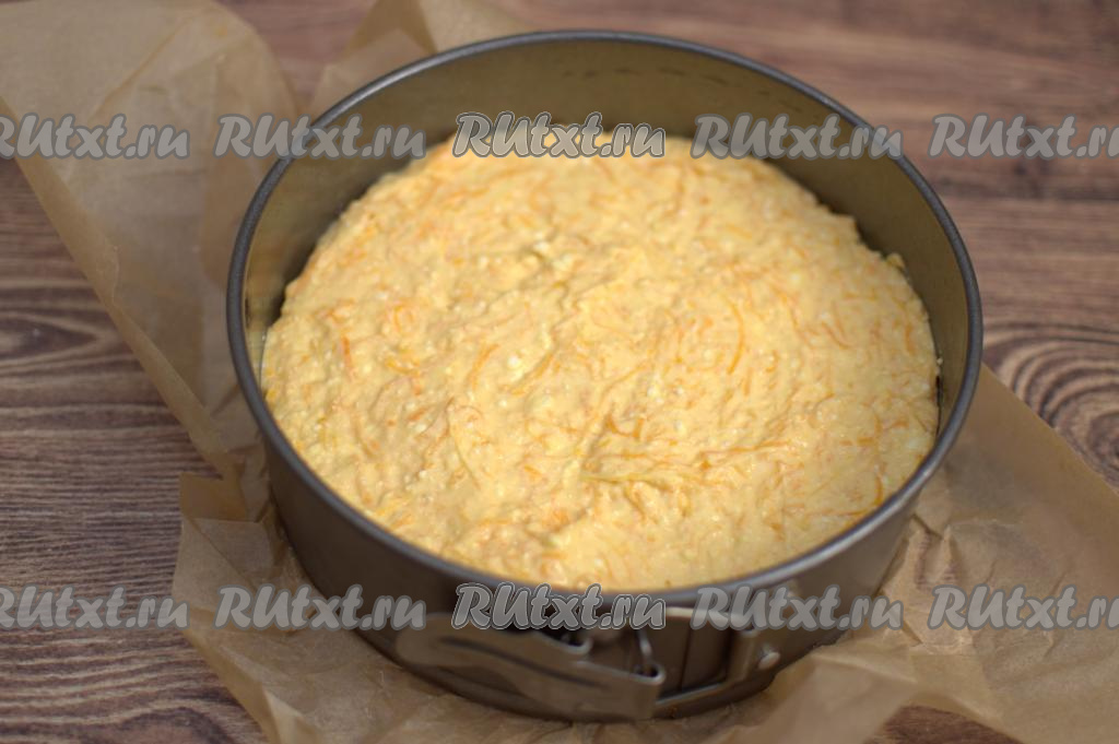 Дно формы для выпечки (у меня форма диаметром 18 сантиметров) застелить пергаментом. Смазать бока формы растительным маслом. Выложить в форму творожно-тыквенное тесто, разровнять.