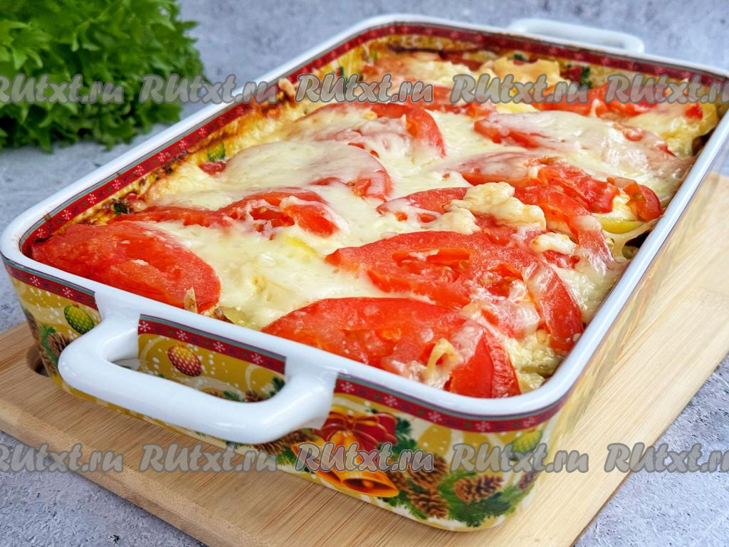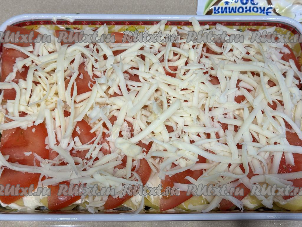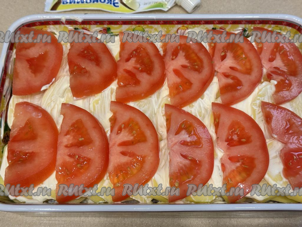 Поверх картошки разложить помидор, нарезанный на полукружочки (или кружочки), можно слегка присолить помидоры.