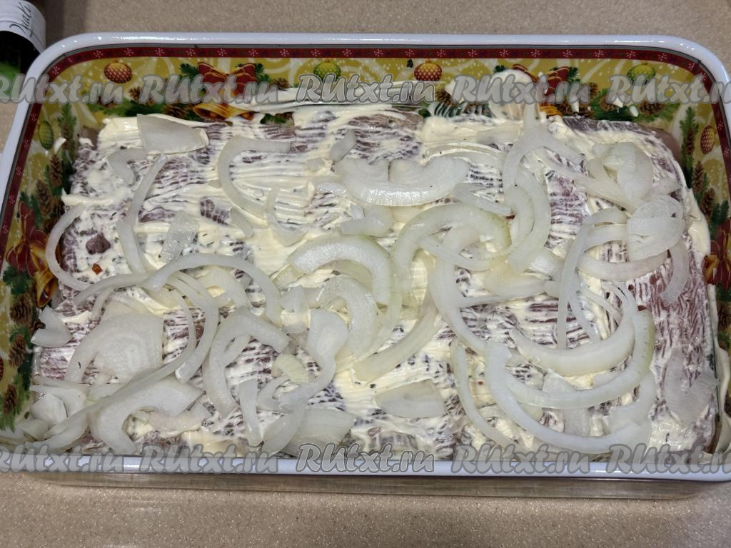 Лук нарезать на полукольца, разложить поверх индейки, смазанной майонезом.