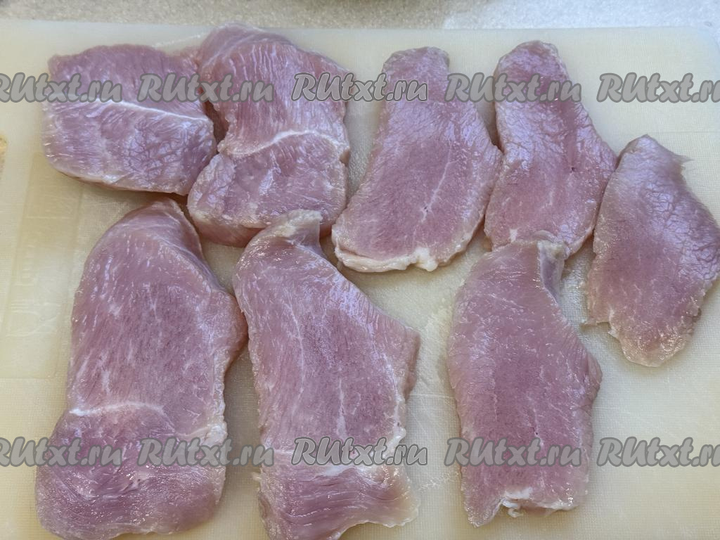 Филе индейки нарезать на кусочки толщиной примерно 1 сантиметр.