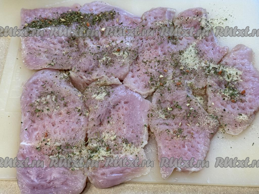 Слегка отбить кусочки индейки кулинарным молоточком. Посолить и поперчить индейку по вкусу. Втереть специи в мясо со всех сторон.