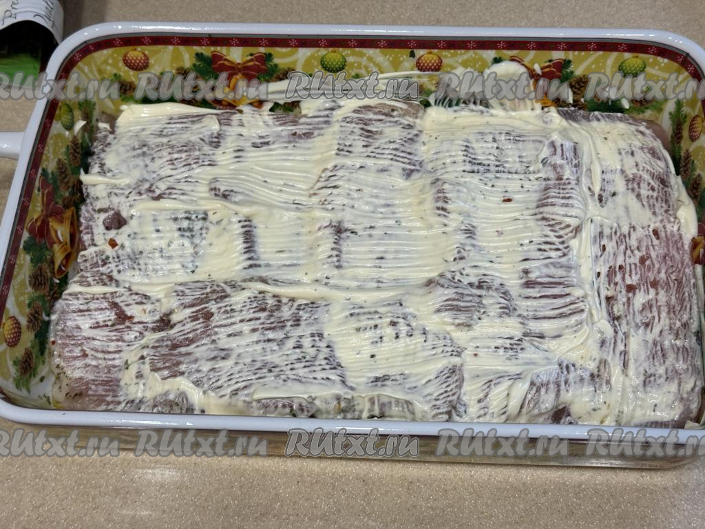 Смазать индейку 1,5 столовыми ложками майонеза.