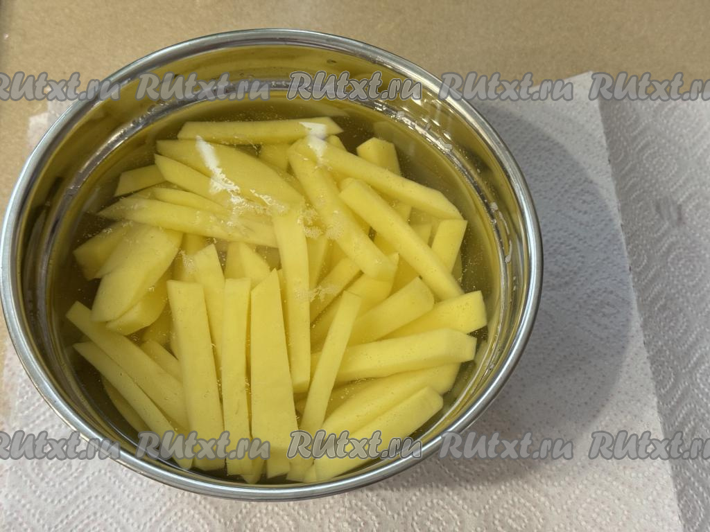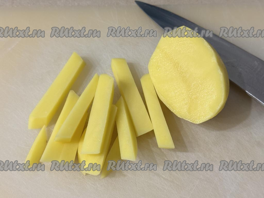 Нарезать картошку на длинные брусочки, примерно, одинаковой толщины (толщина брусочков должна быть чуть меньше 1 сантиметра).