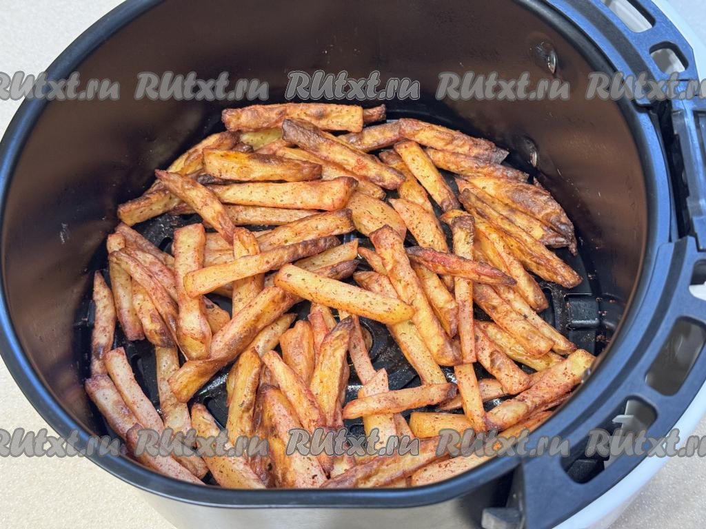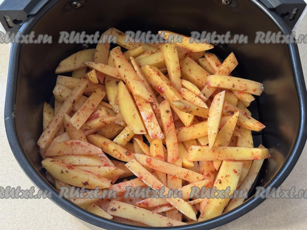 Запекать картошку фри в аэрогриле при температуре 180 градусов 25-30 минут (до готовности). В процессе запекания нужно 2-3 раза вынимать чашу из аэрогриля и встряхивать картофель (или переворачивать), чтобы он равномерно подрумянился со всех сторон. Готовность картофеля нужно поверять ножом или вилкой, если картошка прокалывается легко, значит она готова.