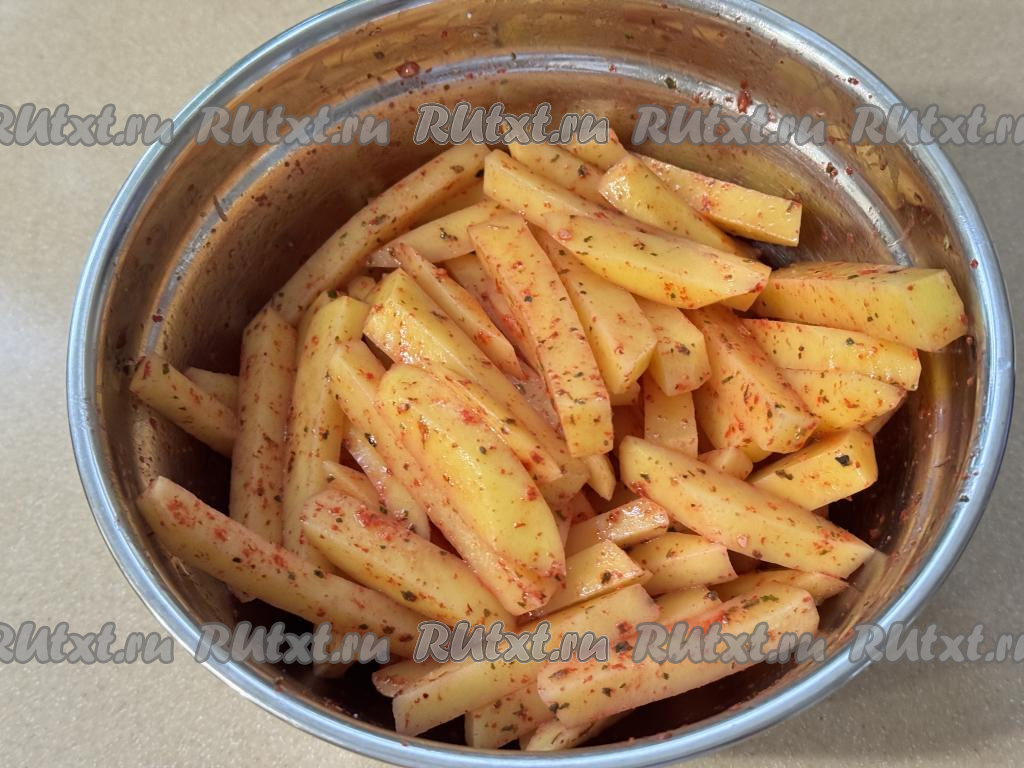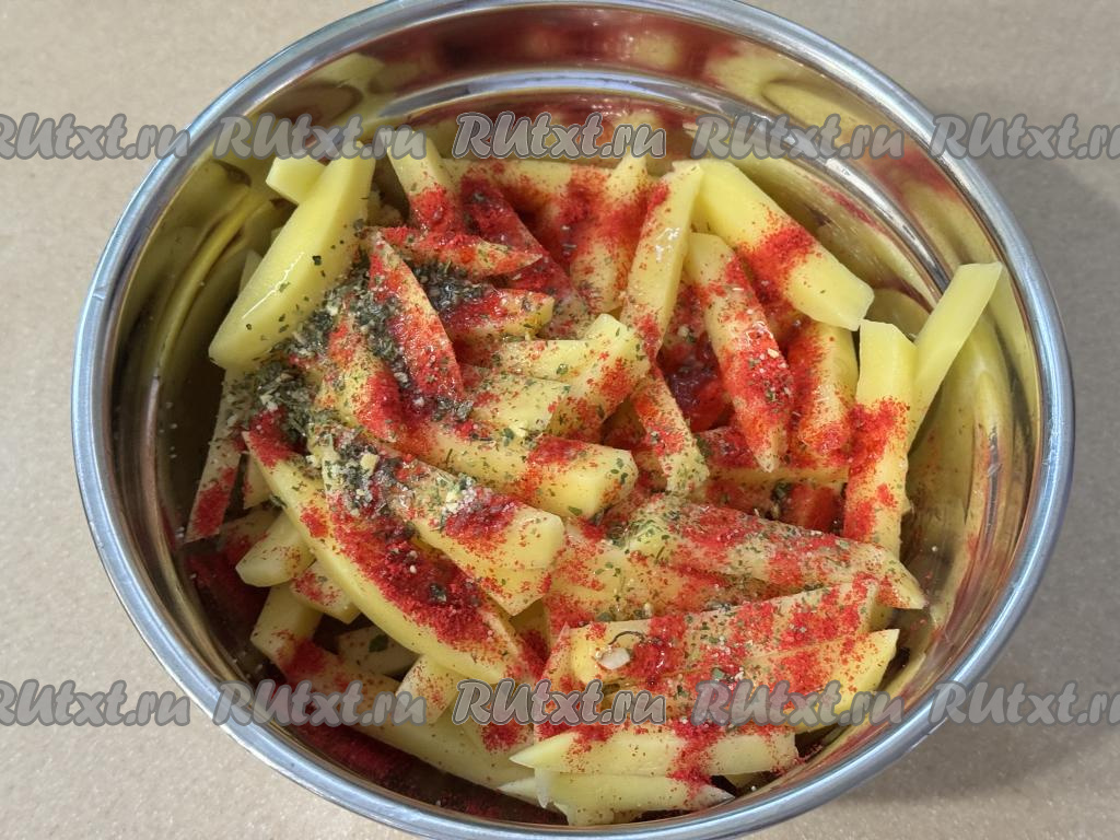 Переложить картофельные брусочки в миску, добавить растительное масло, соль и специи (я в качестве специй использовала паприку и соль, смешанную со специями).