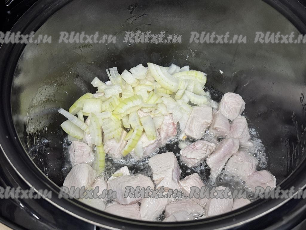 Лук нарезать четверть кольцами, добавить в чашу мультиварки с обжаренным мясом, перемешать, готовить в течение 3-4 минут, иногда помешивая.