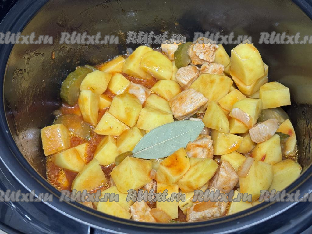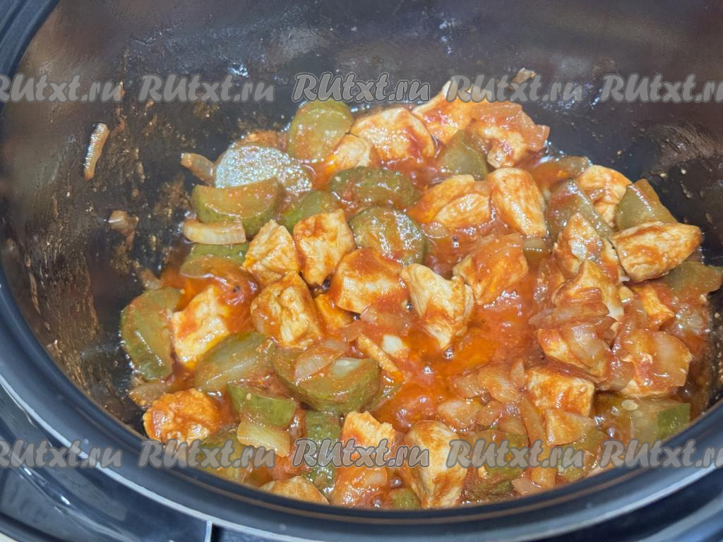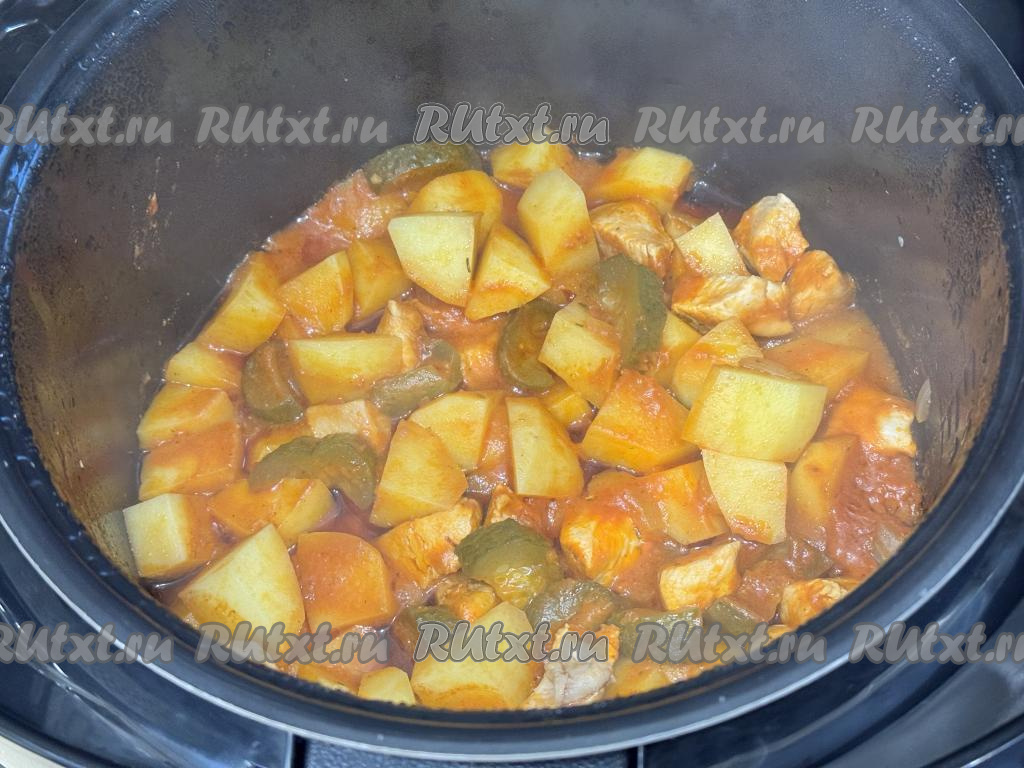 Закрыть крышку мультиварки, выставить режим "Тушение" на 1 час. Готовить азу из курицы до звукового сигнала.