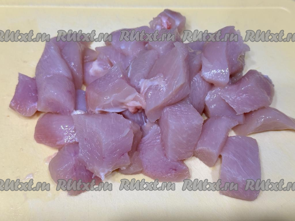 Куриное филе нарезать на кубики с размером стороны примерно 2 сантиметра.