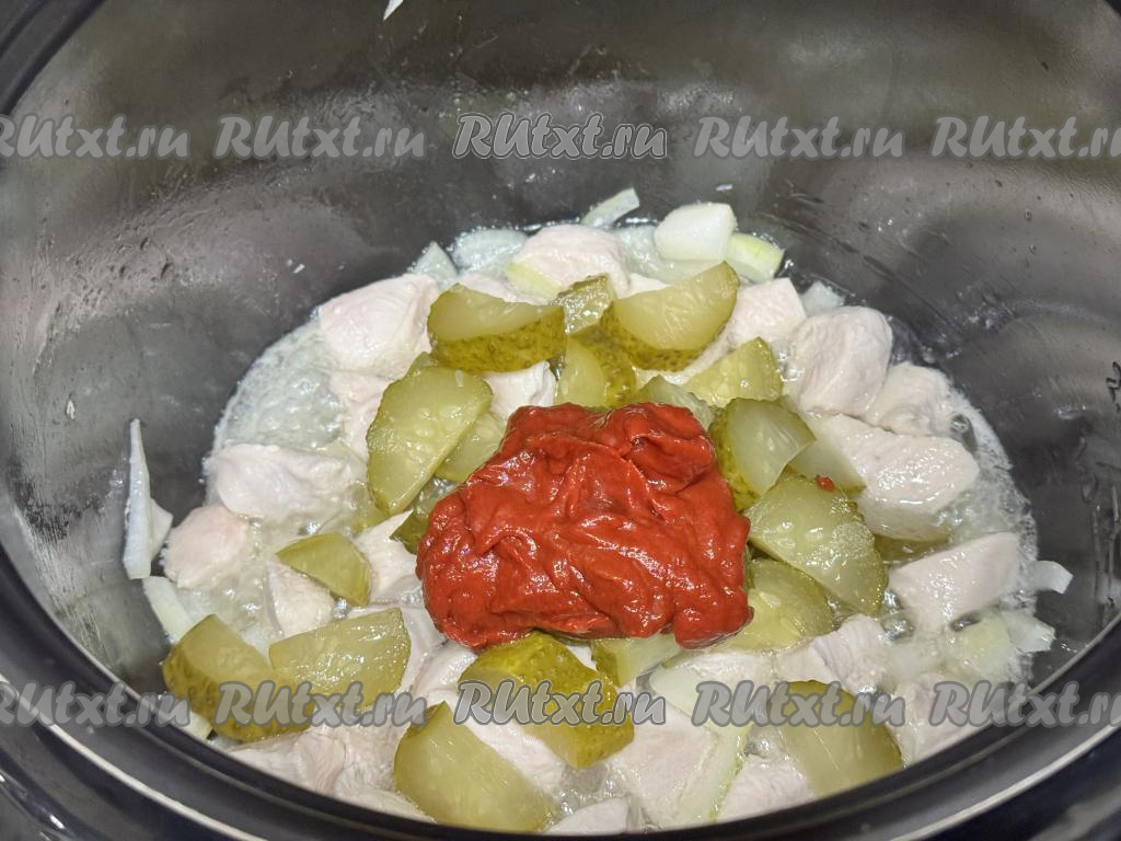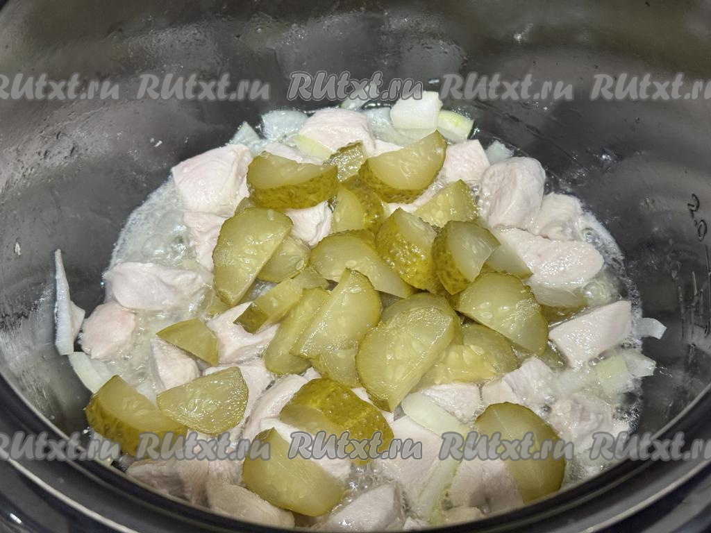 К куриному мясу, обжаренному с луком, добавить солёные огурцы, нарезанные на полукружочки (или брусочки).