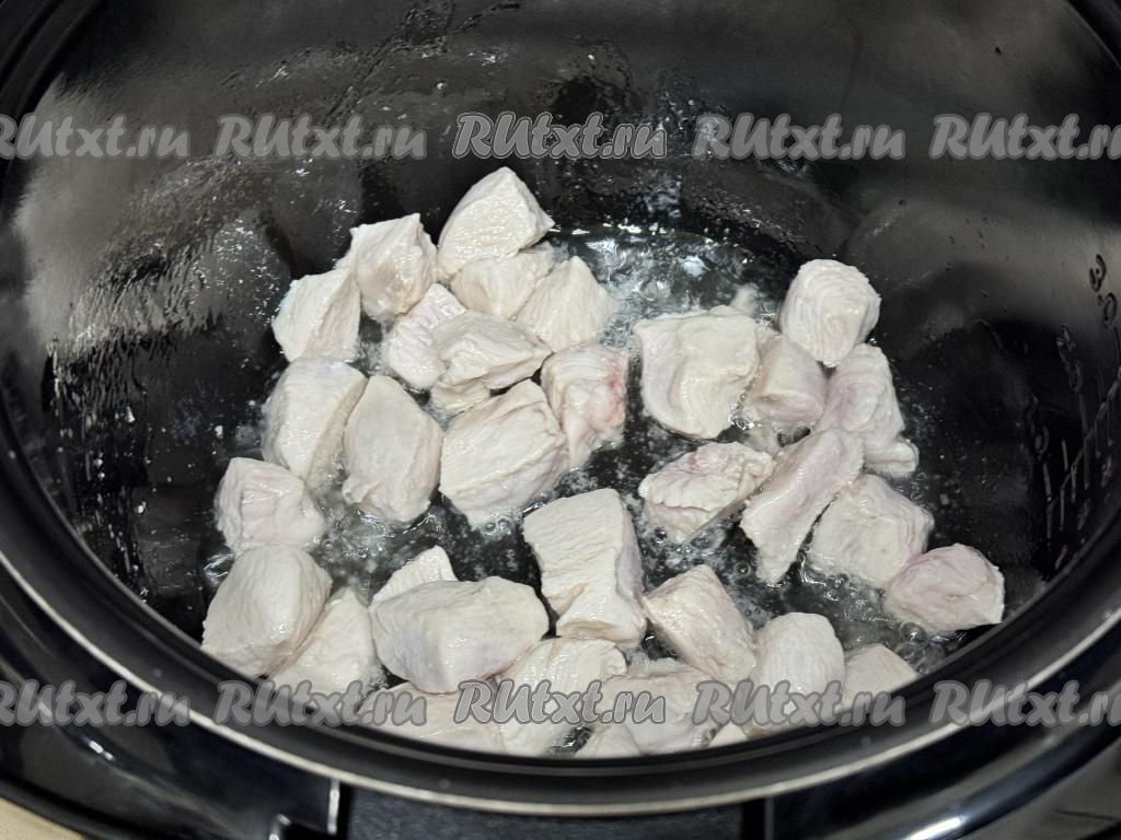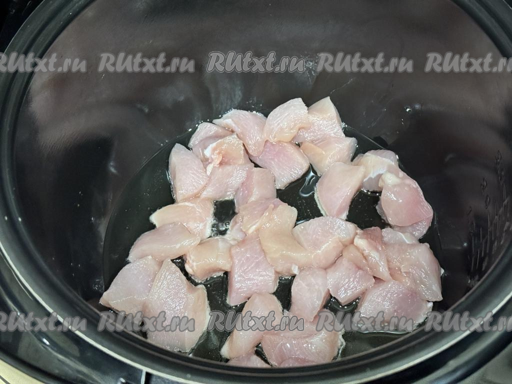 В чашу мультиварки влить растительное масло, после этого выставить режим "Жарка" на 15 минут. Когда масло достаточно разогреется, выложить кусочки курицы в чашу мультиварки.