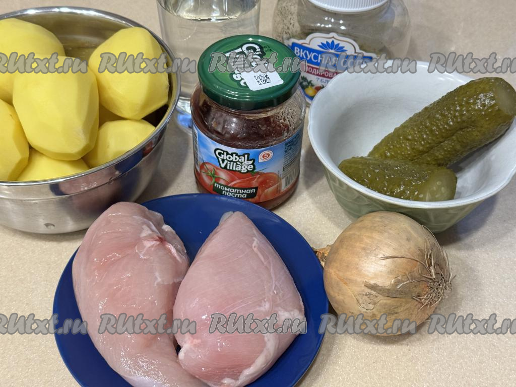 Подготовить продукты. Куриное филе промыть водой и обсушить. Картошку и лук очистить. Очищенный картофель, чтобы он не потемнел, нужно выложить в миску, залить полностью водой.