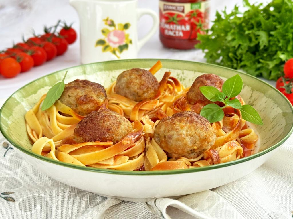Нежные гнёзда из макарон с сочными шариками из фарша достать из чаши аэрогриля, разложить по тарелкам, полить томатным соусом, в котором запекалось блюдо, и сразу же подать к столу.