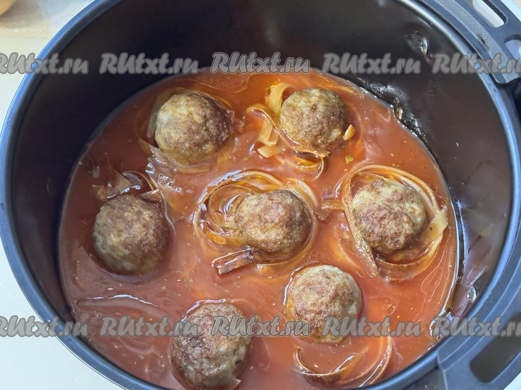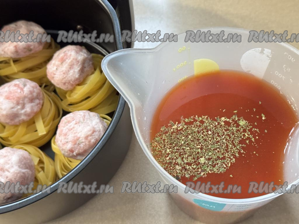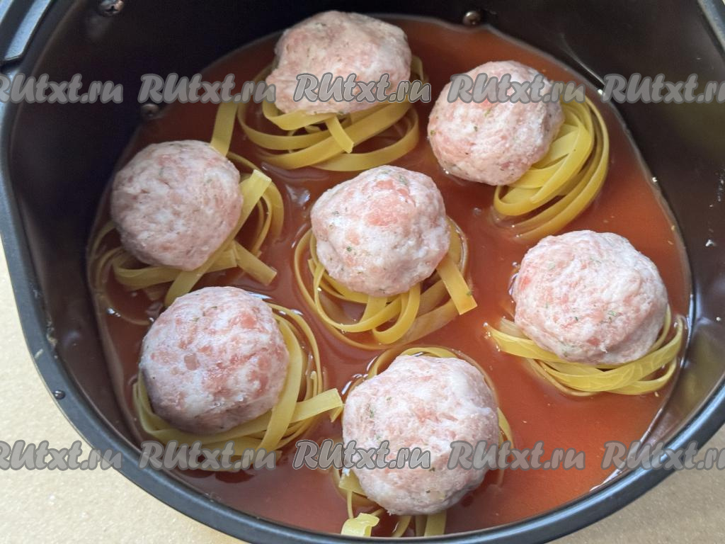Влить соус в чашу аэрогриля с гнёздами из макарон и фаршем. Соус должен практически полностью покрывать макаронные гнёзда.
