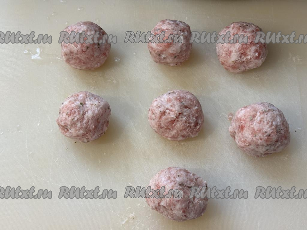 Фарш разделить на 7 равных частей. Из каждой части фарша сформировать круглый шарик.