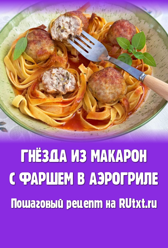Для домашнего обеда или ужина можно без лишних хлопот приготовить в аэрогриле гнёзда из макарон с шариками из фарша. Блюдо запекается в заливке из воды и томатной пасты со специями, которая становится аппетитным томатным соусом. Мясной фарш можно использовать любой, подойдёт куриный, свиной, индюшиный и даже смешанный. И гнёзда из макарон, и мясные шарики из фарша получаются аппетитными, нежными и вкусными. Приготовьте это простое блюдо в аэрогриле и оно внесёт приятное разнообразие в ваше меню!
