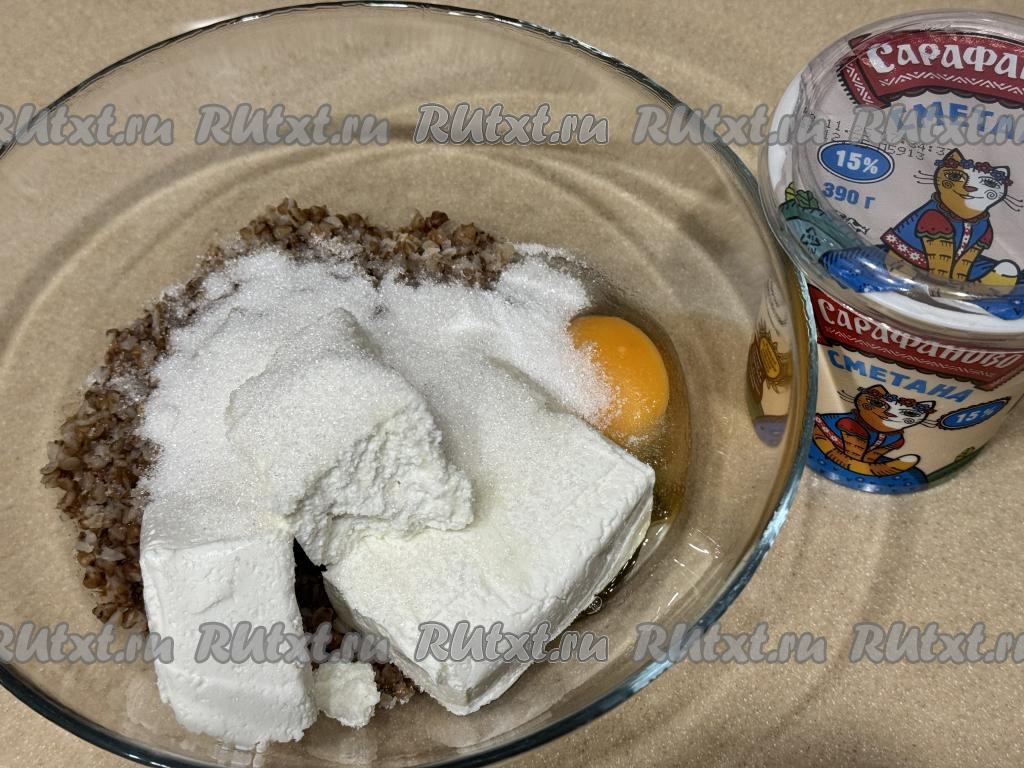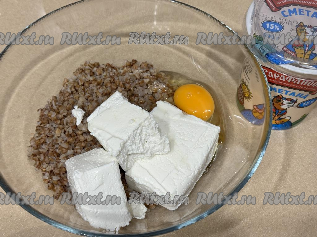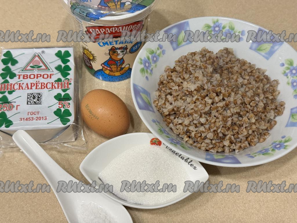 Подготовить продукты. Творог и сметану можно взять любой жирности (я купила творог жирностью 5%, сметану - жирностью 15%). Гречку, если нужно, перебрать, затем выложить в сито, тщательно промыть под проточной водой, лишней воде дать стечь. В кастрюле вскипятить 250-300 миллилитров воды, выложить подготовленную гречку, перемешать, довести до кипения, уменьшить огонь, варить гречку до готовности (ориентировочно в течение минут 20-25, гречка должна стать мягкой). Сварившуюся гречку откинуть на сито, чтобы стекла вода, если вдруг она осталась. Дать гречке остыть. Можно использовать и 300 грамм гречки, оставшейся от обеда или ужина.