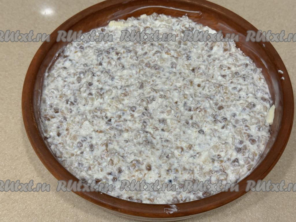 Форму для запекания (я взяла керамическую форму диаметром 20 сантиметров) смазать растительным маслом, выложить творожно-гречневую массу, разровнять.