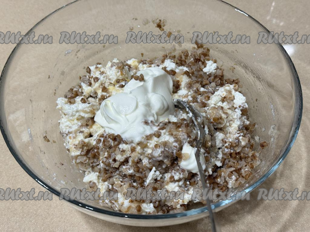 Перемешать творожно-гречневую массу столовой ложкой, добавить сметану.