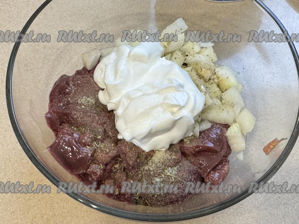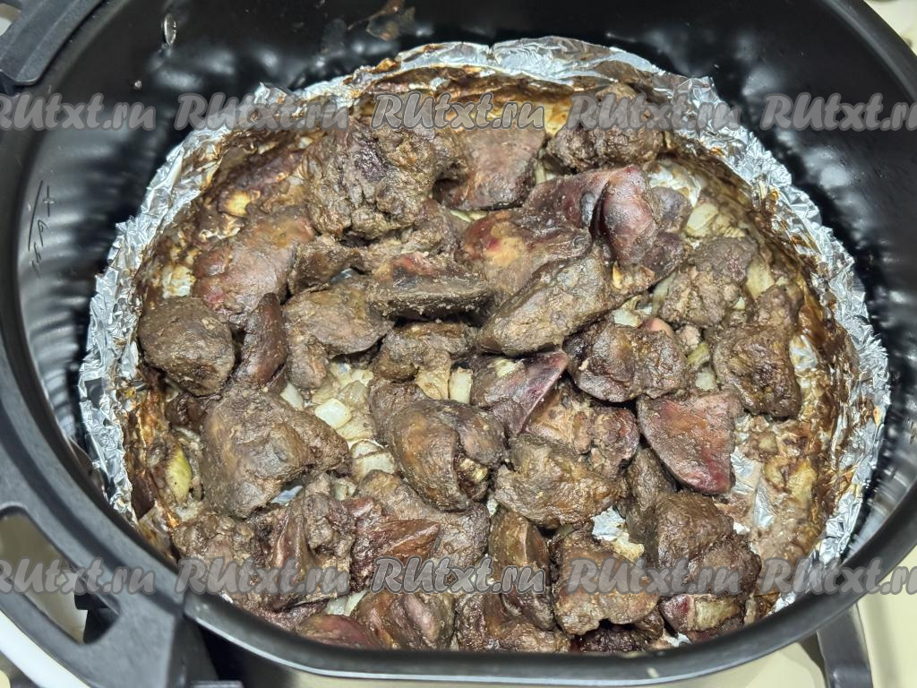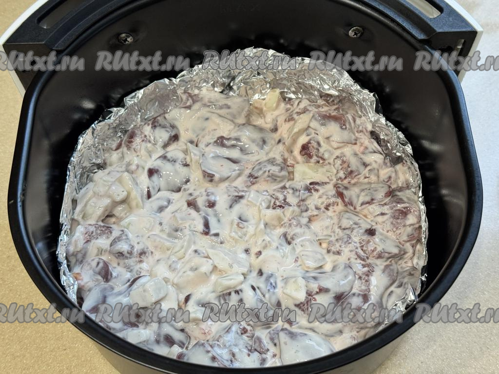 В аэрогриль в чашу из фольги равномерно выложить куриную печень с луком, смешанную со сметаной.