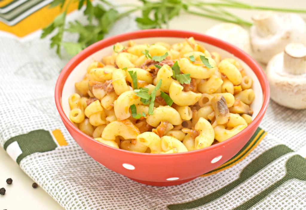Макароны, отваренные до готовности, откидываем на дуршлаг. Когда вода с макарон полностью сольётся, выкладываем их в сковороду с тушёнкой и грибами, перемешиваем. Прогреваем блюдо 2-3 минуты, иногда помешивая, чтобы макароны стали горячими, убираем с огня.