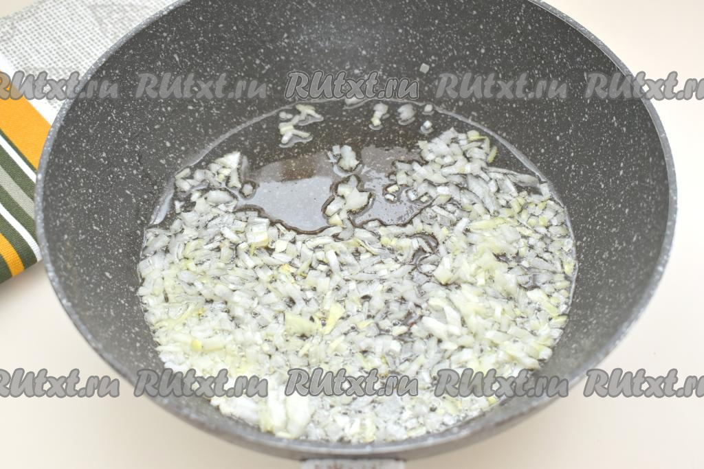 Очищаем морковку и лук. Прогреваем в глубокой сковороде растительное масло, выкладываем мелко нарезанную луковицу. Обжариваем лук до прозрачности (минуты 3-4), иногда помешивая, на среднем огне.