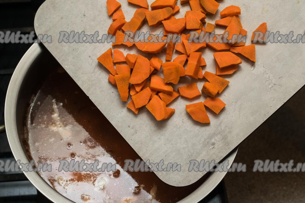 Морковку и картошку очистить, промыть водой. В кастрюлю с процеженным бульоном добавить морковь, нарезанную на полукружочки (или брусочки).