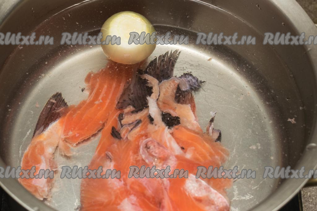 Обрезь форели и очищенную луковицу выложить в кастрюлю, залить 2,5 литрами воды, поставить на огонь.
