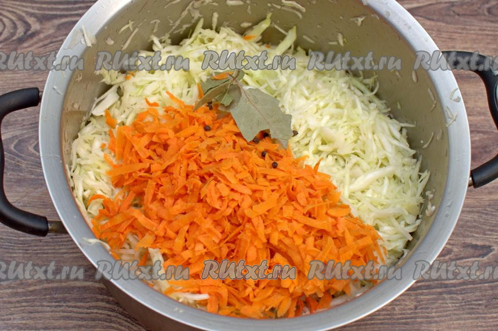 Затем к капусте добавить очищенную морковку, натёртую на крупной тёрке, лавровые листья и чёрный молотый перец.