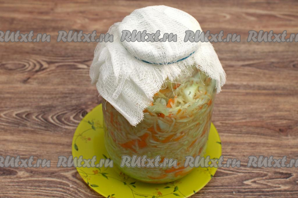 Оставить капусту кваситься при комнатной температуре на 3 суток. Банку я накрываю стерильной марлей и сверху надеваю резинку, но это необязательно, можно просто прикрыть крышкой, так чтобы был выход воздуха. По прошествии первых суток (может чуть раньше, многое зависит и от самой капусты, и от температуры воздуха в помещении) капуста начнёт бродить, с этого момента нужно деревянной палочкой 3-4 раза в сутки прокалывать капусту до дна банки в нескольких местах.
