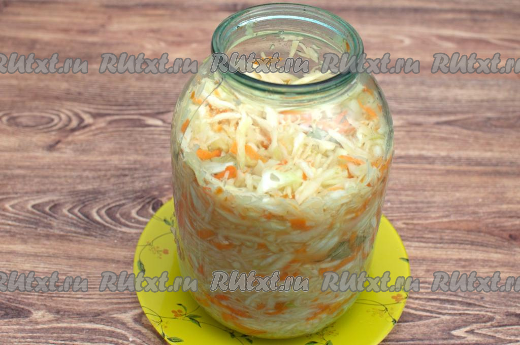 По истечении 3 суток процесс брожения завершится, капуста, квашеная без сахара и воды, будет полностью готова. Но я перед подачей закрываю её крышкой и хотя бы на несколько часов ставлю банку в холодильник, чтобы капуста немного охладилась.