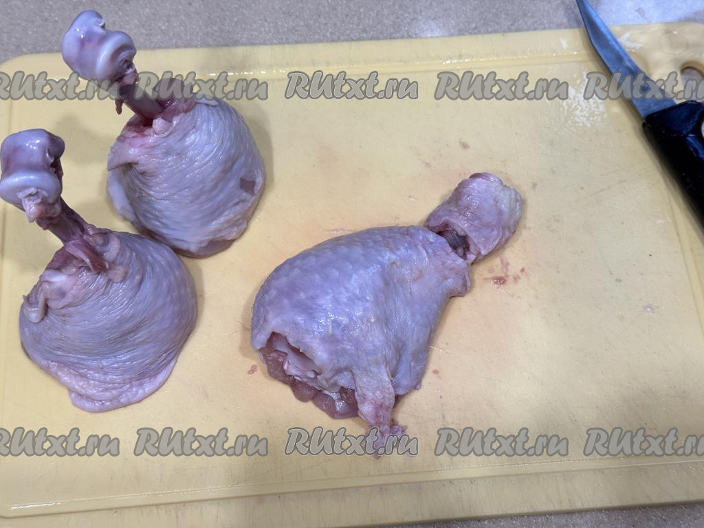 У куриной ножки разрезать кожу по кругу около хрящика. Поставить ножку вертикально (мясом вниз). Руками прижать кожу и мякоть голени так, чтобы она опустилась вниз, у нас получится куриная ножка, напоминающий чупа-чупс на палочке, затем убрать кожу с верхнего хряща. Аналогично подготовить все куриные ножки.