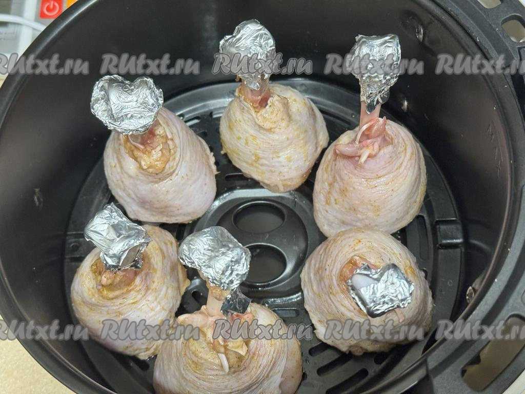Затем обернуть хрящики небольшими кусочками фольги, чтобы они не сгорели при запекании в аэрогриле. Поставить куриные ножки на решётку аэрогриля, как на фото. Выставить режим 200 градусов и время - 15 минут. Поставить чашу с куриными ножками в аэрогриль. По прошествии 15 минут снизить температуру до 160 градусов и запекать ещё 20 минут.