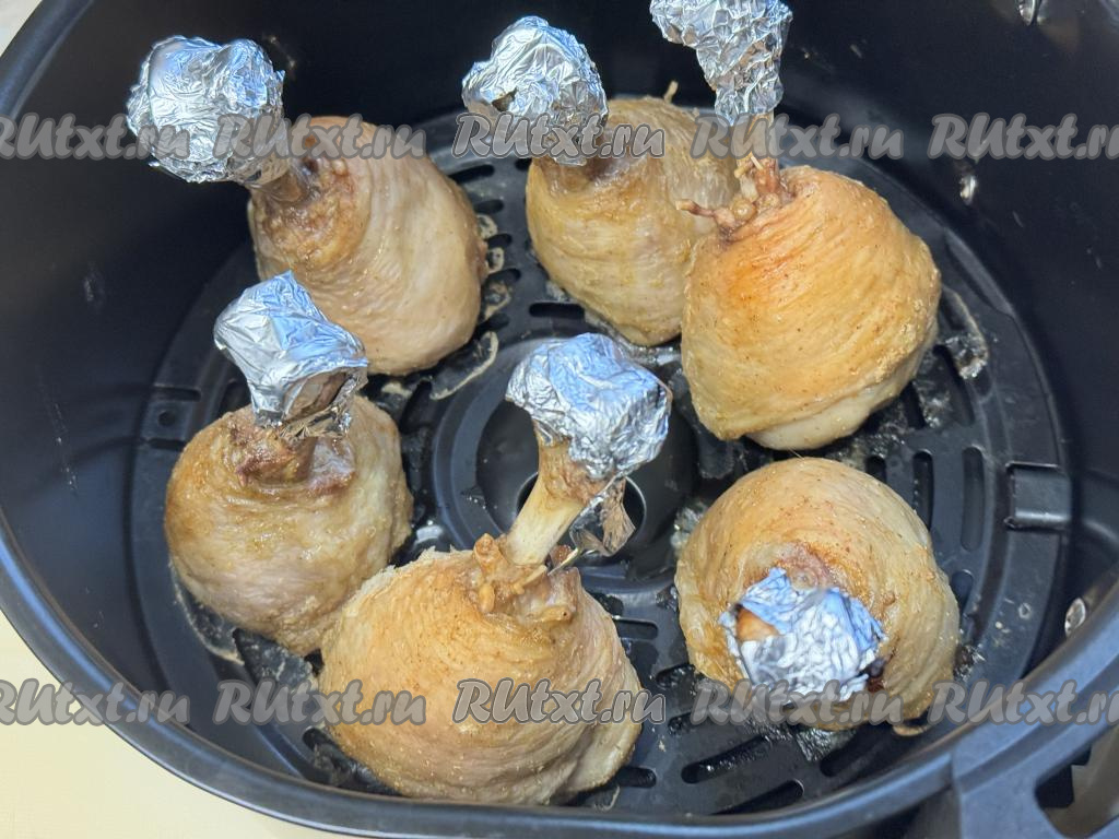 В зависимости от мощности аэрогриля для запекания может потребоваться чуть больше или чуть меньше времени, ориентируйтесь по готовности голеней. Мощность моего аэрогриля 1350 Ватт.